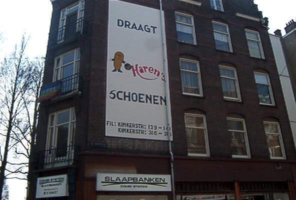 Kinkerstraat. Op de reclame worden de schoenen aangeprezen door een mannetje in