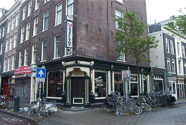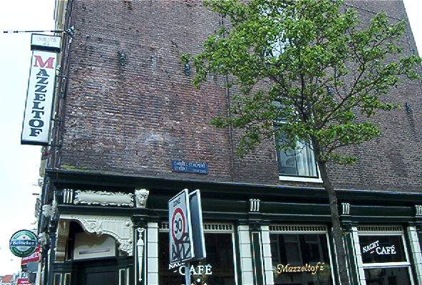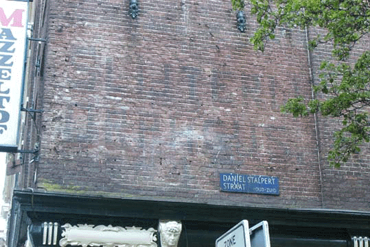 1e etage aan Daniël Stalpertstraat, MANOU... (Mogelijk geen beschildering maar in 2004 verwijderd bord) ...SLIJTERIJ ORPHEUS....