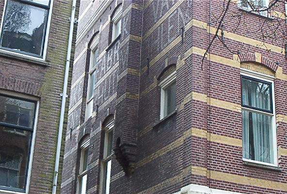 KONINKLIJKE FABRIEK VAN VERBANDSTOFFEN V/H UTERMÖHLEN & CO. Reclameschildering op westelijke zijgevel in steeg. Fabriek gevestigd in 1893; predicaat "Koninklijke" verleend in 1901 dus van na die tijd.