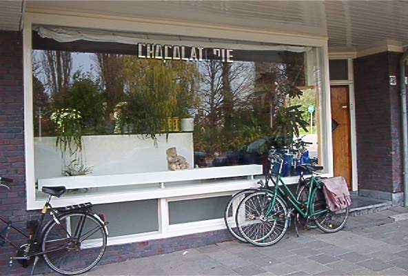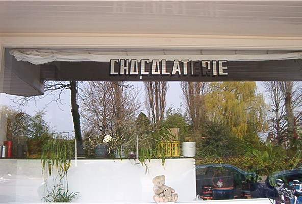 CHOCOLATERIE. Zilver en zwart op glas (geverfd of staniol ?) op v.m. etalageruit.