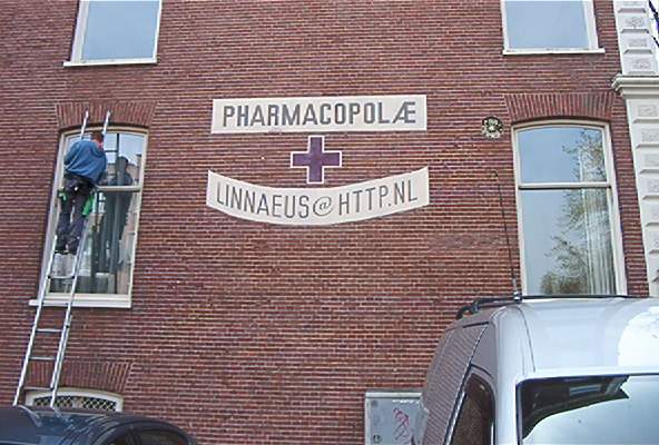 PHARMACOPOLĘ / + / LINNAEUS@HTTP.NL Op zijgevel Wagenaarstraat nieuwe reclameschildering in quasi-oude stijl + i vorm wit-omrand rood kruis.