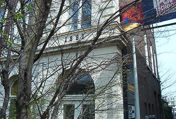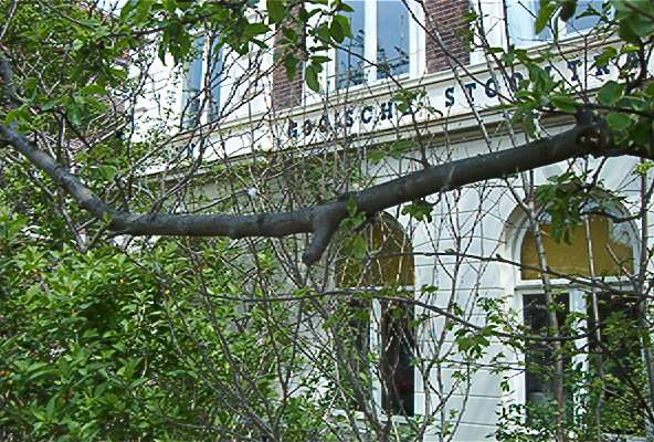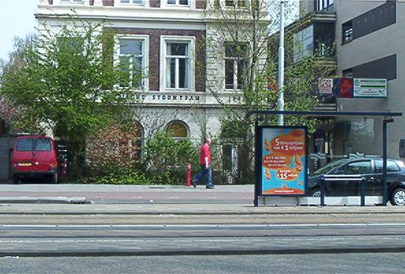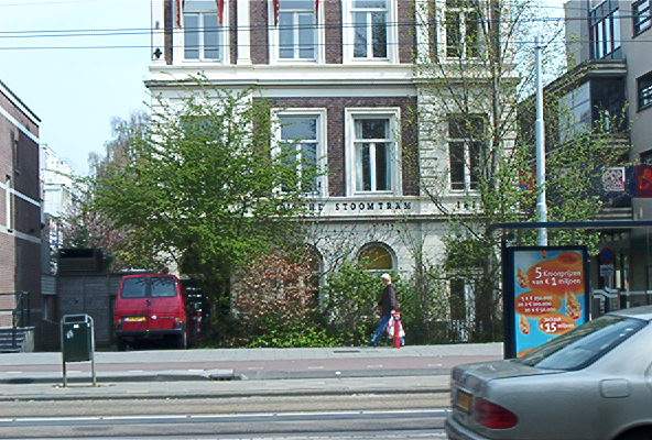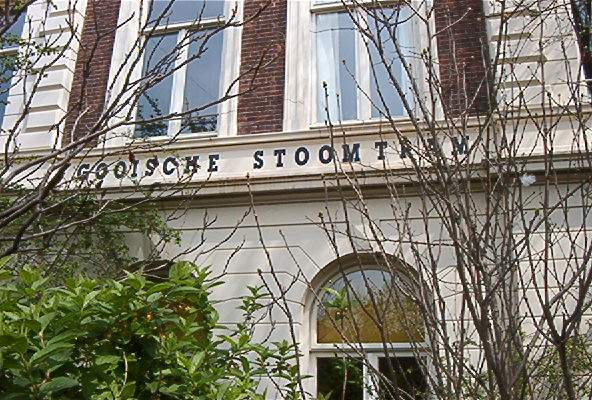 ANNO GOOISCHE STOOMTRAM 1881. Reclameschildering in zwarte letters op wit vlak, goed onderhouden.