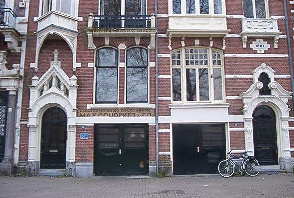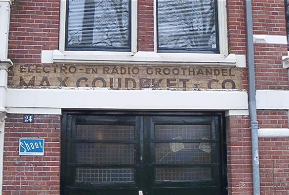 ELECTRO- EN RADIO GROOTHANDEL MAX GOUDEKET & CO. Reclameschildering met zwarte letters met schaduwen in wit/geel.