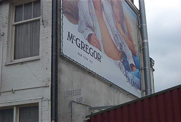 CAFÉ / DE OMVAL / PETIT-RESTAURANT / AMSTEL BIER / ESPRESSO / BAR. De gehele schildering, met uitzondering van ESPRESSO BAR is verdwenen achter een zeer groot reclamebord van Mc GREGOR.