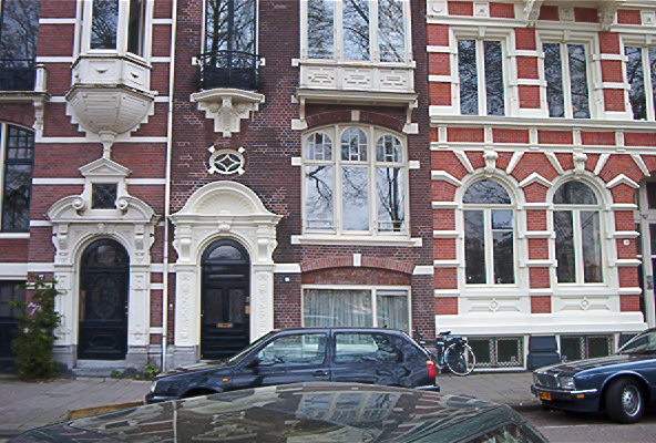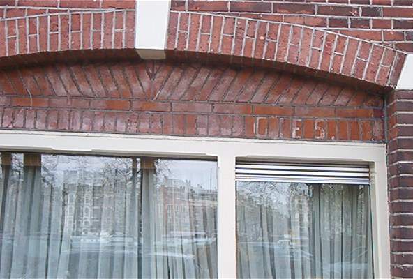 ..A.....................OGIES. Resten van reclameschildeing in witte verf op baksteen. G onzeker. Voor de A alleen een H of een N.